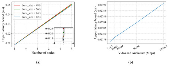 First, we simulate the case of single flow single switch, divide the traffic case of tele-operation, select the burst size of 6 DoF and divide it equally, and simulate the above case in turn and get its theoretical delay upper limit according to Equation (20), and explore the accuracy of the theoretical delay compared with the simulated delay under different burst sizes, the comparison results are shown in Figure 3a.