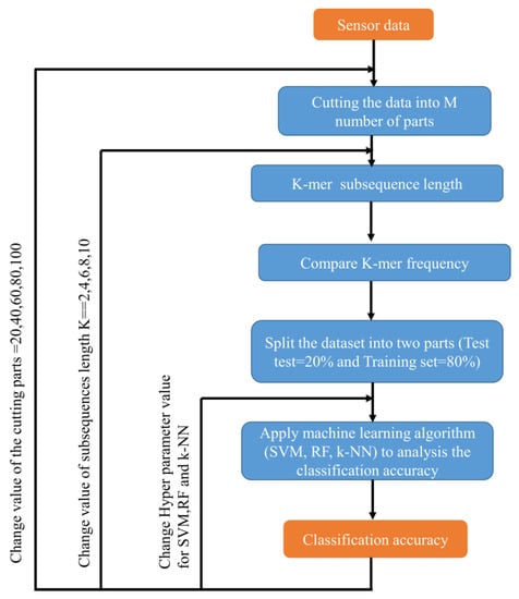 K-mers are often used in bioinformatics to control the quality of generated sequences [17], classify metagenomics [18], and estimate genome size [19]. Haodong yan et al. [20] developed a method called DeepTE that uses CNNs to classify unknown transposable elements. K-mer counts were implemented by DeepTE to transfer sequences into input vectors and can be identified domains inside TEs to correct misclassification. F.P. Breitwieser et al. [18] present an approach that integrates fast K-mer-based classification with an effective algorithm for calculating the number of distinct K-mers present in each species in metagenomics samples. They demonstrated that applying distinct K-mer counts improves species identification accuracy and that K-mer counts seem to be very effective for detecting false positives. Machine learning approaches with K-mer have recently been found to perform better on pattern recognition problems [21,22,23,24]. These methods are created by extracting the frequency of fixed-length k from DNA sequences. This research will focus on combining the K-mer frequencies with certain supervised machine-learning algorithms to enhance efficiency. We believe that integrating K-mer with machine learning algorithms will increase the classification accuracy of the sensor data.