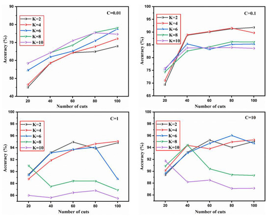 SVM is a supervised machine learning technique that builds a hyperplane with the maximum possible margin to classify the data [37]. A kernel function might be introduced to project the data into a higher dimension to make the data linearly separable. The penalty coefficient (C) is a parameter used to tune the SVM accuracy. There is no rule for selecting a C value; it depends entirely on testing data. We used different C values and selected the value which gave the best classification accuracy. Initially, we selected a value of C = 0.01, which provides very low accuracy of results, while increasing the C value from 0.01 to 0.1, 1, 10, the accuracy was also increased. Finally, 94.11 ± 0.3% of the accuracy result was achieved at the value of C = 10. The average precision, recall, and F-score values for K-mer-based SVM were 0.941 ± 0.003, 0.941 ± 0.003, and 0.941 ± 0.003. Figure 5 shows the accuracy results for the K-mer-based SVM model with the various numbers of cuts, different subsequence lengths, and different C values.