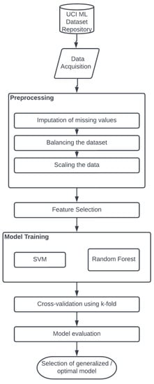 A healthcare support system based on machine learning for the prognosis of the CKD was introduced in [13]. The decision tree (DT) algorithm showed the highest accuracy. However, an inconsistency lay with the imputation of the missing data that was performed without considering the presence of outliers; in addition, no data balancing was performed. This study uses the correlation-based feature selection (CFS) method for feature selection. This study developed the proposed model with the use of 15 features; however, again, no hyperparameter tuning was performed. Lastly, machine-learning and deep-learning techniques were employed for the construction of an ailment classifier in [14]. The highest accuracy was achieved by the random forest algorithm. Similarly, the imputation was implemented without considering outliers in the numerical features, and the training was utilized on the imbalanced dataset. Hyperparameter tuning was not performed while training the model, and the developed models were not cross-validated.