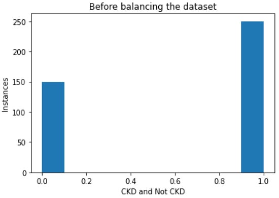 The CKD dataset comprises outliers and missing data that need to be cleaned up during the preprocessing stage. There was also an imbalance in the dataset that caused a bias in the model. The preprocessing stage consists of the estimation and imputation of missing values, noise removal such as outliers, and dataset balancing [16]. To perform the preprocessing steps, the categorical features in the dataset were initially replaced with dummy values such as 0 and 1 using a label-encoding technique.