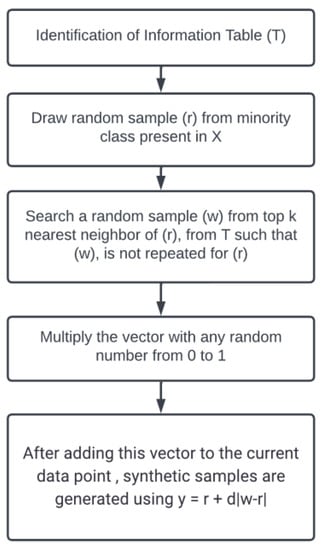 The balancing of the dataset was performed with the use of an oversampling method. Rather than the random generation of data points in terms of balancing, a SMOTE-based oversampling algorithm was employed in this work [18]; the SMOTE algorithm workflow is illustrated in Figure 3. To be more specific, a random sample from the minority class was initially selected, and k nearest neighbors were identified. Then, the vector between the selected data point and the neighbor was identified. This vector was multiplied by any random number from 0 to 1. Lastly, after we had added this vector to the current data point, the synthetic data point was obtained.