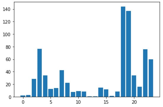 Features with better chi-squared scores were selected for the prediction because model prediction could thus be enhanced. This test is based on hypothesis testing, and the null hypothesis states that the features are independent of one another. The chi-squared score was calculated with the use of Equation (1):