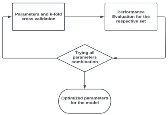In this work, regarding HPT, the method of GridSearchCV was implemented in order to find the optimal values of the selected HP values. The workflow of GridSearchCV for the selection of HPs is illustrated in Figure 6.