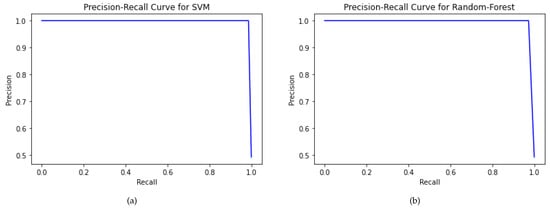 The PR curve is a plot drawn between true positives and false positives, used to gauge a classifier’s sensitivity [29]. The area under the curve (AUC) ranges from 0 to 1 [31]. The higher the AUC score is, i.e., closer to 1, the higher the model’s efficacy is. The testing set accuracy of SVM and RF is and , respectively.