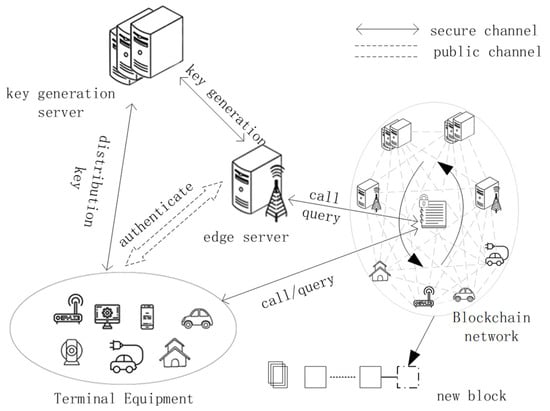 Figure 1 shows the infrastructure architecture for authentication. The main entities include the terminal equipment (U), the key generation server/center (KGC), the edge server (ES), and the blockchain network.