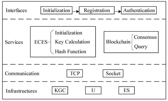 Figure 2 shows the hierarchical structure of the proposed authentication scheme. The elliptic curve encryption system (ECES) is employed to generate the authentication information. The interfaces in Figure 2 correspond to the three main phases of the authentication scheme. The edge computing applications invoke the three interfaces in turn to establish the secure connection between U and ES if it is feasible. The initialization phase initializes the ECES parameters and the public and private key parameters for the KGS. In the registration phase, U and ES separately apply for keys from KGC and are registered to the blockchain network constructed by the development tool Ganache [28]. In the mutual authentication phase, U and ES communicate with each other according to TCP protocol and socket, and access part authentication elements by querying the smart contract of the constructed blockchain network. We will describe in detail the implementation process of these three phases for the whole scheme in the next subsections.