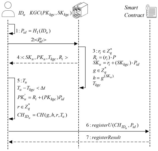 - The terminal equipment U hashes the unique identity through to generate a pseudo-identity and sends the pseudo-identity to the KGC through a secure channel. After receiving the key request message from the terminal equipment, KGC generates a random number as the temporary private key, where , and gets the temporary public key by computing . It gets and uses it as the private key of the device by computing . It gets the public key of the terminal equipment by computing and generates the public and private key information of the device. KGC generates a random number from as the generated public key of the chameleon hash function, gets the public key of the terminal equipment by calculating as the public key of the trapdoor of the terminal equipment, and generates the current timestamp . KGC sends the information to the terminal equipment.