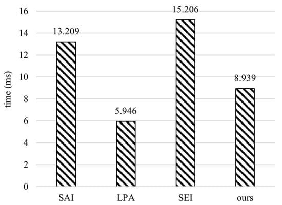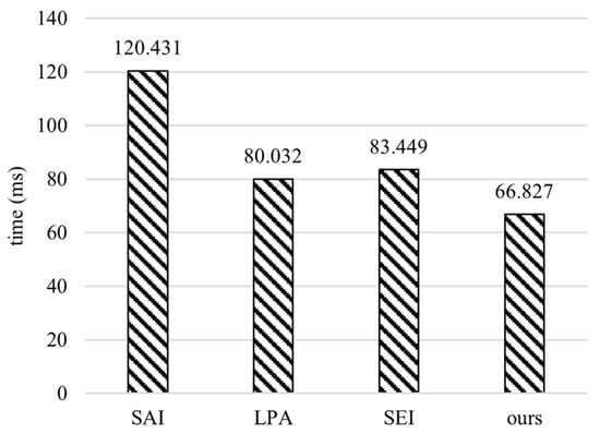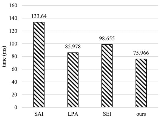 The comparison of the computational overhead on the edge server side is shown in Figure 7. The computational overhead of our scheme is lower than that of SAI and SEI, both of which use the most time-consuming bilinear mapping pairing operation at the server side and, thus, they have higher time consumption. Our scheme achieves 32.33% and 41.21% lower overhead on the edge server side than SAI and SEI, respectively. However, LPA performs better than the proposed scheme. This is because LPA has less computation operations and computational overhead in the authentication process at the edge server side, according to Table 5. Although our scheme has a 33.48% higher computational overhead on the edge side than LPA, it still outperforms LPA in term of the overall overhead.