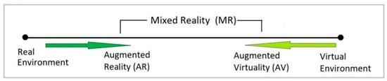 Milgram et al. [] regarded the real environment and virtual environment as a closed continuum, as depicted in Figure 1. From Figure 1, the far left is a purely real environment, and the far right is a purely virtual environment; everything in between is mixed reality, in which both real and virtual objects are present. The position of a user interface in this closed set is determined by the number of computer-generated elements in the user environment. In Figure 1, the far left represents a user interface entirely in the real physical world, whereas the far right represents a virtual environment entirely generated by computer. Between the extremes are AR, which refers to a real world augmented by virtual items, and augmented virtuality, which refers to an immersive virtual environment with elements from the real world.
