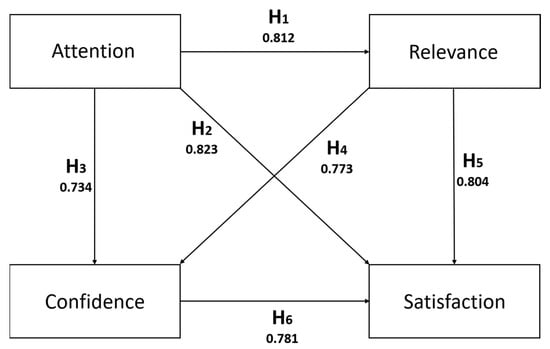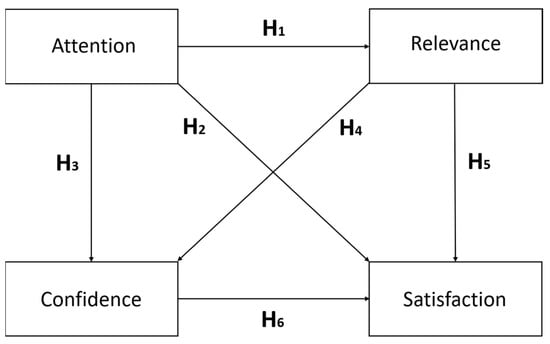 The four elements of the ARCS model must be matched with each other to induce learning motivation. Our research hypothesis is based on Keller’s ARCS model [,] and refers to the hypotheses of Chang et al. [,] and Lin et al. []. Figure 2 illustrates the study’s theoretical model. The hypotheses tested in the model include the following: