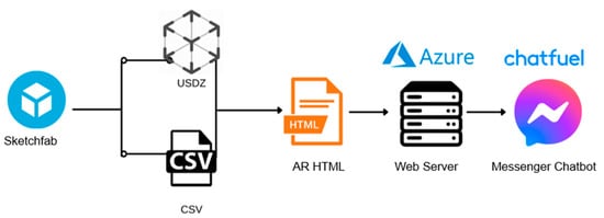 In this study, we used the Chatfuel platform [] to build a chatbot and linked to an AR HTML webpage written through the Adobe Brackets [] compiler. The content used 3D models of living creatures from the Sketchfab platform [] and complied with the conditions of Creative Commons 4.0 to download images in USDZ format to present the appearance of the creatures, allowing students to manipulate the AR creature application and understand the morphological characteristics and distribution of the creatures through the compilation of textual descriptions and video teaching contents of the creatures. The system architecture is shown in Figure 3.