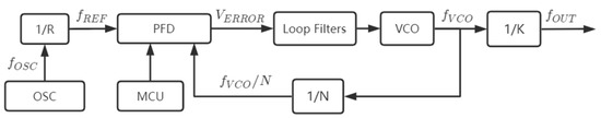 A phase-locked loop (PLL) is a phase feedback control circuit that adjusts its internal oscillator’s frequency and phase using an external input reference signal [12]. It mainly comprises a phase detector (PD), a loop filter (LF), a frequency divider (FD), and a voltage-controlled oscillator (VCO) to form a closed-loop system. Figure 1 shows a typical schematic of the phase-locked loop [13].