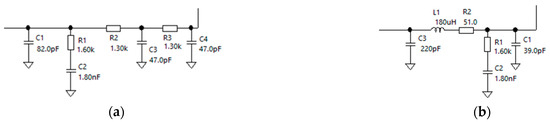 The topology and components of this loop filter differ from the passive fourth-order RC filter. The passive fourth-order RLC filter comprises a pre-filter C3 and an inverted L filter (L1, C2). The filter is coupled with a series inductor to obtain a better roll-off characteristic [17]. The inductor has a self-inductance effect and high inductive resistance to AC. However, it cannot reduce the output voltage compared to the resistor. When passing current, the inductor generates an electromotive force at each terminal to suppress the current changes such that it can operate as a filter. As the current increases, some of it will be stored in the inductor, gradually increasing the current. Meanwhile, as the current decreases, the reverse electromotive force hinders its decrease. Accordingly, a smooth DC current is obtained. Let us compare these two filter circuits. The filter resistor has the same resistance to DC and AC. In contrast, the filter inductor has a large inductance to AC and a small resistance to DC. This improves the filtering effect without reducing the DC output voltage. Therefore, the RLC filter is superior to the RC filter and obtains a smoother signal. Figure 3 compares the two circuit topologies.