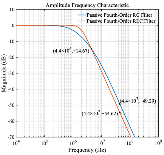 In practice, the filter’s amplitude–frequency characteristic curve cannot reach the rectangular shape in the ideal case. Therefore, the roll-off characteristic can be defined to measure the ideal degree of a filter, determining the transition zone between the passband and the stopband and the verticality degree of this transition zone, that is, the approximation degree of the rectangular response. As shown in Figure 5, the roll-off values of the passive fourth-order RC and RLC filters are 34.62 dB/decade and 39.95 dB/decade, respectively. The roll-off characteristic of the passive fourth-order RLC filter is more significant than that of the passive fourth-order RC filter, demonstrating the better filtering effect of the former.