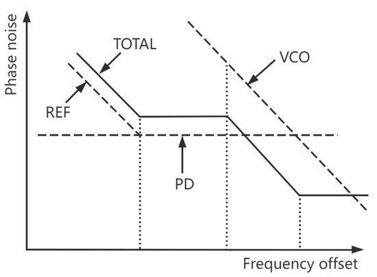 The phase noise introduced by the reference source, the phase detector, and the frequency divider is low-pass. This is the primary factor influencing the total phase noise in the loop bandwidth. Moreover, the phase noise caused by the VCO is high-pass, mainly affecting the out-of-band phase noise [22]. The in-band output signal’s phase noise is presented in (11), where is the normalized noise ground of the PD, and describes the frequency division ratio.