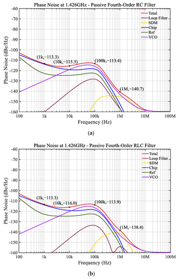 Phase noise simulation results: (a) passive fourth-order RC filter and (b) passive fourth-order RLC filter.