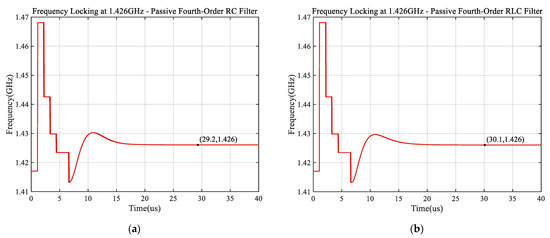 Loop capture time simulation results: (a) passive fourth-order RC filter and (b) passive fourth-order RLC filter.