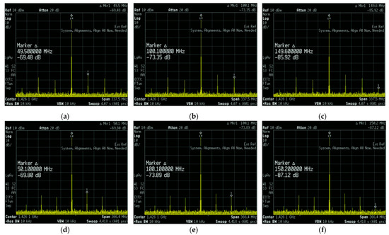 Spurs are unwanted periodic components of the spectrum. Spurs can reduce the signal-to-noise ratio of a wireless communication system and increase signal jitter [28]. For both the passive fourth-order RC and RLC filters, the spur suppression of a signal is evaluated with an output frequency of 1426 MHz. The experimental spur suppression results are shown in Figure 11.