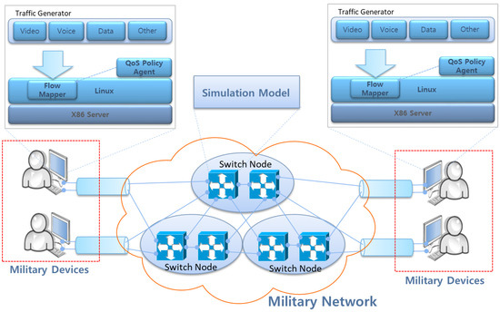 Figure 1 shows the switch node configuration of a military network for setting up the simulation environment of our entire study. This paper uses a part of that environment. We implemented our proposed simulation model (see Figure 2 for details) in each switch node of the military network supporting each military device with the traffic generator.