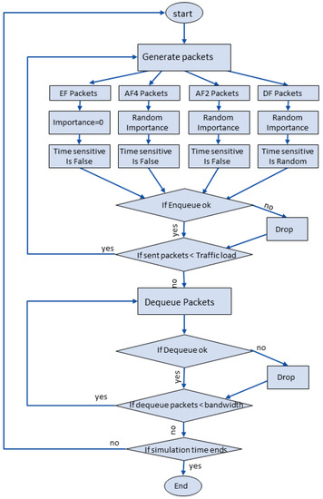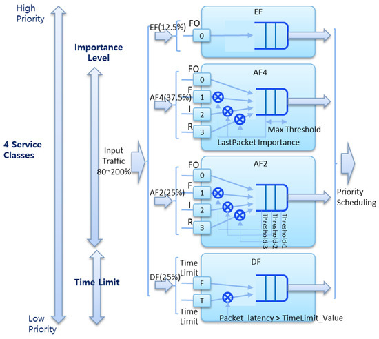To implement the proposed triple-metric-based AQM, packets with four different service classes are simultaneously generated with different ratios. They have different priorities, importance levels and time-limit flags. As shown in Figure 3, the importance of all EF traffic is 0 (high priority). The importance is randomly allocated between 0 and 3 to the AF4 and AF2 traffic. In case of the DF traffic, time sensitive information is randomly allocated. Then, each switch node processes individual packets according to the proposed algorithms.