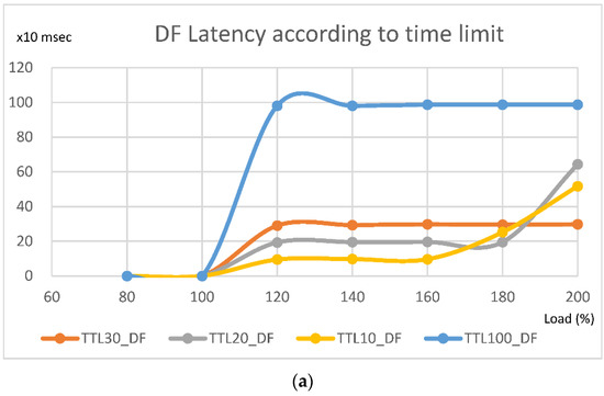 Figure 4a shows the latency characteristics according to the delivery time-limit value by changing the DF traffic load to 80–200% with only the DF traffic as input. As the input load increases, so does the traffic propagation delay. Traffic for which the delivery time-limit flag is true is dropped when the delay exceeds the specified time. Therefore, the delay of the transmitted traffic without being dropped can be maintained within the specified time.