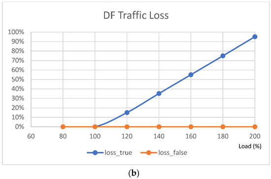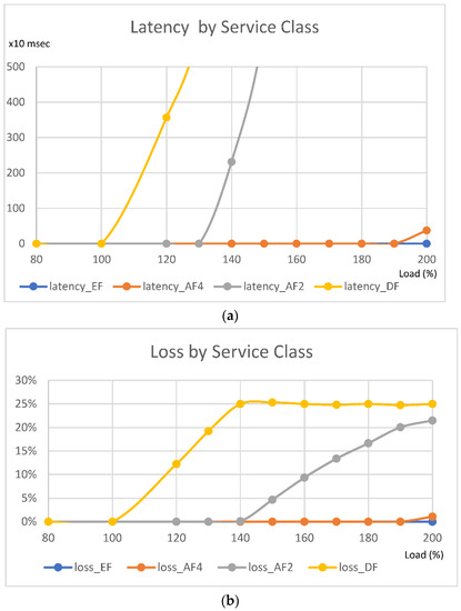 Figure 7b shows that, consistent with the above prediction, the loss of the DF traffic increases when the load exceeds 100%, and the loss of the AF2 traffic occurs when the load exceeds 140%. When the total load reaches 200%, the sum of the EF and AF4 traffic, which are the highest priorities, becomes 100%, so it is the point at which the loss begins (some loss occurs).