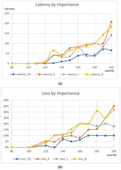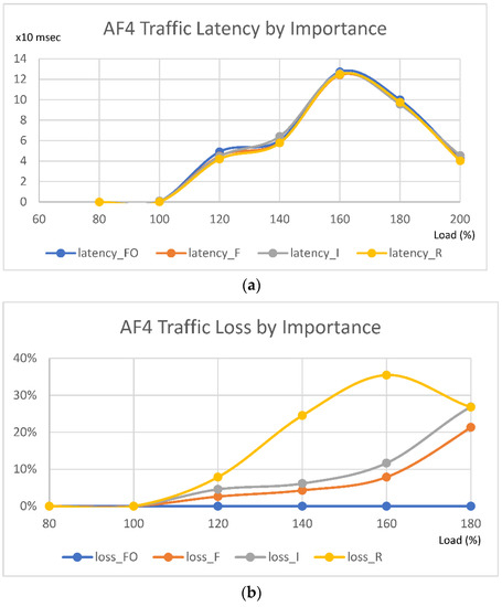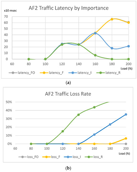 For the F4 traffic, the processing method is determined according to the queue length and importance. Figure 5a confirms the result while changing the load to 80–200% with only the AF4 traffic as input, and randomly assigns four levels of importance (FO, F, I, R). In this result, when the load exceeds 100%, transmission delay occurs; however, when the queue length exceeds the threshold, a drop is made so that the delay does not increase excessively. A typical maximum tolerable latency for multimedia traffic is around 150 ms [33], and it can be seen that all traffic latencies in the experiment are less than 150 ms.