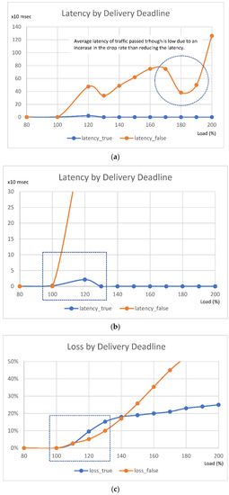 The last result shown in Figure 9c is a case where the traffic with the four service classes are mixed, and differentiation according to time limit appears in the 100–133% load period. It can be seen that the drop according to the delivery time limit is controlled in the DF traffic, which is the lowest priority, so that it is effective in delivering the traffic within a time limit even when overloaded.