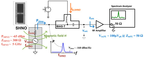 The SHNO electrical model used in this work corresponds to a sinusoidal voltage source, VSHNO(t), in series with a complex output impedance, ZSHNO (Thevenin’s model). Available output power, PSHNO, and oscillation frequency, fSHNO, are fixed by SHNO nanomaterial used in the fabrication procedure, the applied magnetic field, H, and the electrical operation point given by its bias current, IB,SHNO. From extracted measurements in a setup such as that of Figure 2, typical values for oscillator parameters are around PSHNO ≈ −65 dBm, ZSHNO ≈ 300 + 0j Ω, and fSHNO ≈ 5 GHz. Despite the excellent capability of SHNOs in high-frequency signal generation (up to 22 GHz [19]), due to the limitations in the CMOS-FE circuitry in conjunction with the high value of ZSHNO, SHNO operating conditions are modified to oscillate at a lower frequency, such as 4 GHz. Under these conditions, the expected peak voltage values for oscillations entering in the RF-FE in the case of considering a standard input impedance of Zin,FE = 50 Ω will be around Vin,FE ≈ 100 µVpk.