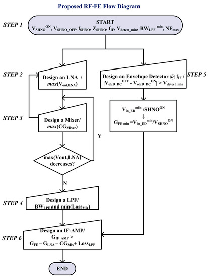 - Start by fixing a set of initial parameters and limits: SHNO voltage where it is considered to be turned on and off, VSHNOON/OFF, SHNO oscillation frequency fSHNO, SHNO output impedance ZSHNO, intermediate-frequency fIF, voltage difference that the comparator can discern, Vdetect_min, minimum bandwidth of the LPF, BWLPFmin, and maximum noise figure NFmax of the RF-FE.
