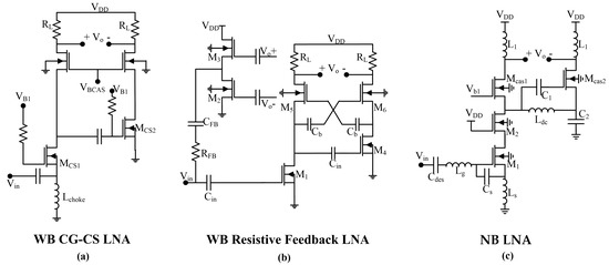 LNAs designed in this work: (a) WB-CG-CS LNA [22]; (b) WB resistive feedback LNA [23]. (c) NB-LNA (modified architecture from [24]) (Bias not shown for clarity).