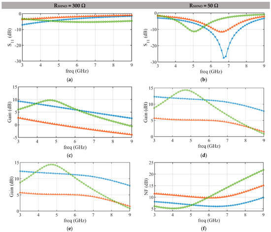 For each of the LNAs of Figure 5, we chose a design with a good trade-off between insertion loss and gain for RSHNO = 300 Ω at frequencies in the range of 5 GHz, and whose electrical characteristics, obtained from an electrical simulator, are presented in Figure 6a,c,e (left column of plots). In particular, for the NB-LNA, we applied the design meth-odology of [25,26] with the semi-empirical MOS transistor model of [27].