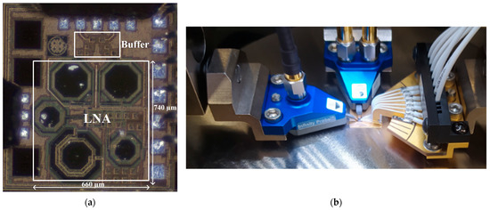 The NB-balun LNA was fabricated under TSMC 180 nm technology. Its area is (740 × 660) µm2, and whose microphotograph is shown in Figure 7a. Its current consumption is 7.0 mA for VDD = 1.8 V at the frequency of interest. The LNA is fabricated with an output buffer for test purposes. The equipment used for test purposes has been the Agilent N5230A Network Analyzer, the Agilent N8974A Noise Figure Analyzer, the Marki BALH-0010 balun, and the Cascade Microtech M150 measurement platform (see Figure 7b). After de-embedding setup effects, the measured S11 and S21 (with the standard 50 Ω impedance of the Network Analyzer) are plotted in Figure 8 in blue, and the simulated ones are plotted in orange. We also include S11 and S21 values translated to 300 Ω (in green) for comparison purposes with the simulations presented in Figure 6. As observed, the matching, gain and noise figure lost some performance, but we consider it acceptable at the frequency of interest.