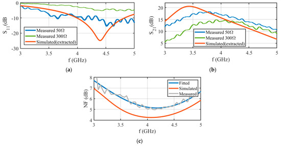 Characterization of the fabricated NB-balun LNA: (a) S11, (b) S21, (c) NF measured and simulated for Rs = 50 Ω (extracted vied).