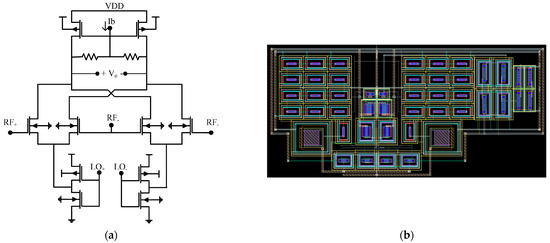 Thus, we move to active mixers, among which we chose the one by Klumperink et al. [28] (Figure 9) over others such as the Gilbert architecture because the noise produced by the input transistors and LO port is common mode noise, which is rejected at its differential output, reducing the NF of the mixer; also, the conversion gain would be lower in the Gilbert cell at our working frequencies. The mixer was co-designed with the LNA [29], by reducing the mixer input transistors to decrease, as much as possible, the load of the LNA without diminishing the conversion gain of the mixer excessively. Despite the mixer gain achieves GActiveMix = 8.5 V/V (see Figure 10), the gain of the combined block [LNA + mixer] achieves 30 V/V (schematic view) because of the interaction between them.