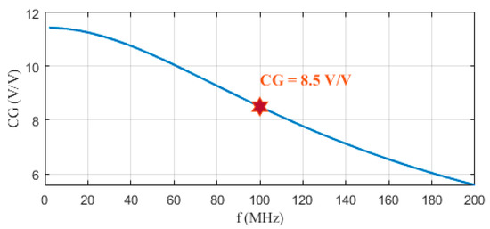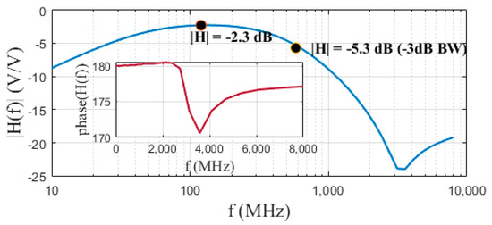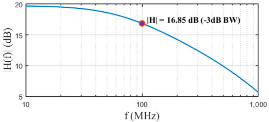 Furthermore, the magnitude of its transfer function is given in Figure 14, where the −3 dB bandwidth is in 106 MHz, providing at this point a gain of 16.85 dB.