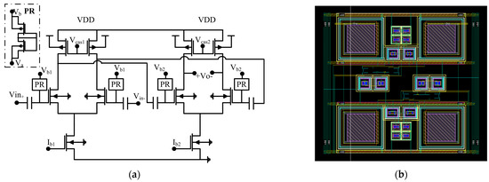 The intermediate-frequency amplifier is designed using the two-stage differential pair-type architecture of Figure 13a, where pseudo-resistors were used to bias the input transistors of both stages. In Figure 13b its layout is given.