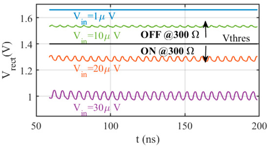 The following block after the intermediate-frequency amplifier is the envelope detector. Its function is to try to differentiate when the SHNO oscillator is on or off. Here, our intention is not to generate a perfectly shaped envelope signal, especially because, with this technology and at the working frequency fif in the order of 100 MHz, it is not feasible. The architecture we use is a modified version of the envelope detector presented by Xia in [31], and shown in Figure 15. To have a detectable signal at its output (with respect to when the input signal is negligible), its input voltage should be higher than 40 mVpp (i.e., the SHNO is oscillating with a reasonable amplitude), which imposes a strong constraint to the FE blocks behind it. It forces the gain of the previous blocks to be of, at least, 100 V/V, i.e., 40 dB. The envelope detector is adjusted to have an output whose DC component is proportional to the input signal amplitude. Its behavior is exemplified in Figure 16, whose output is given for four envelope-detector inputs, Vin,env = {1, 10, 20, 30} µV as well. It should be noted that in this architecture, the relationship is inverse, i.e., the higher the amplitude, the lower the DC output. Whether the system considers that the SHNO oscillates (SHNO ON) or not (SHNO OFF) depends on the threshold voltage, Vthres, chosen. In the case exemplified here, Vthres = 1.4 V was taken, above which the SHNO is considered OFF and below which is considered ON.