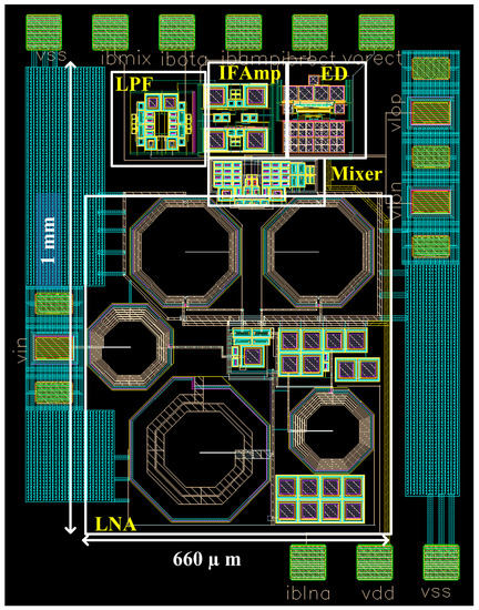 Considering the designs of the LNA and mixer as almost fixed—they were optimized in their extracted layout version—the design of the rest of the blocks were slightly adjusted to adapt them to the real load imposed by the consecutive block that follows each of them.