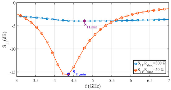 When only the NB-LNA is considered, and the extracted view is used, as shown in Figure 8.a, the circuit is matched at 4.4 GHz with S11 = −25 dB, for RSHNO = 50 Ω. However, when all the front end is simulated (with post-layout), the best coupling between the SHNO and the LNA frequency is maintained at 4.4 GHz, with a S11 = −16 dB (see Figure 18).