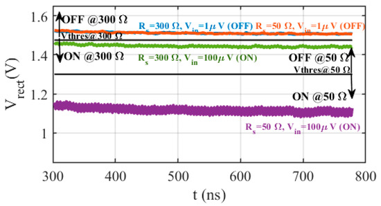 Finally, we evaluated the complete front end by injecting two possible input voltages: (1) Vin,FE = 1 µV, which exemplifies the SHNO output when it is switched off, and (2) Vin,FE = 100 µV, in which the SHNO is oscillating with a sufficient amplitude. The output of the envelope detector for both voltage values are reported in Figure 19. Depending on the RSHNO value, a correct choice of the threshold voltage will enable or not the correct discrimination of the SHNO operating state. Here, for RSHNO = 50 Ω, Vthres = 1.3 V, and for RSHNO = 300 Ω, Vthres = 1.475 V, to do the distinction of the status of the SHNO.