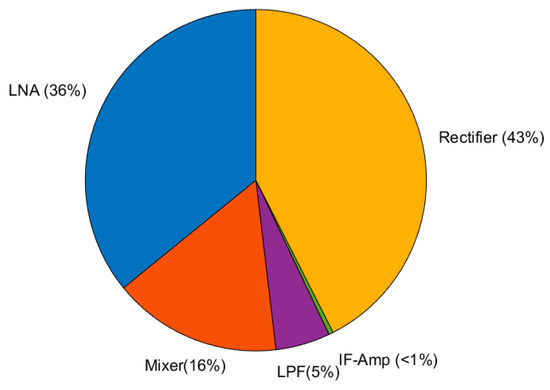 The power consumption of the total FE is 15.4 mA at a supply voltage VDD = 1.8 V, and whose distribution is presented in Figure 20. As expected, most of the power consumption is divided between the LNA and the ED block; the former drains such a high amount of current due to the need to match the LNA input with RSHNO = 300 Ω and to increase its gain, and the latter because of the chosen high-frequency fIF.