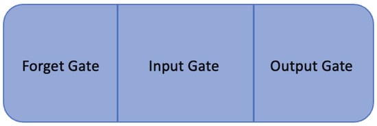 LSTM (long short-term memory) is a form of recurrent neural network (RNN) that gains superior results when dealing with time-series data, removing vanishing gradients and long-term dependencies. The architecture of LSTM is made up of a cell and three gates (input, output, and forget) [17,18] as shown in Figure 1.
