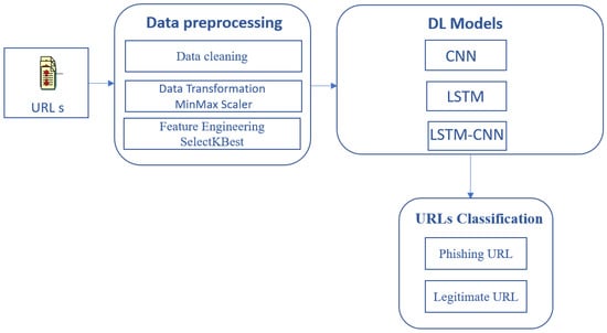 In this section, the important details of the models’ configuration are discussed. The framework of the model incorporates of four stages as shown in Figure 4. The first stage concerns the features of the URLs, which are obtained from the dataset [31]; the second stage involves pre-processing, in which we detected null values and scaling values of feature selection, which contributes most to the target variable by using SelectKBest; the third stage is the training of three different models, namely LSTM, CNN, and LSTM–CNN by building a deep learning approach. Finally, as the evaluation of the approach using a number of indicators to measure how the model performs in detecting phishing websites, the fourth stage is the classification of the webpage URLs as legitimate or phishing.