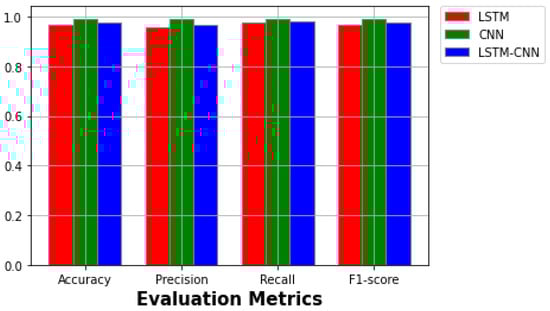 The three proposed methods showed good results, which are shown in Table 4, also reflecting the optimal choice of parameters. After implementing, training, and testing the LSTM, CNN, and LSTM–CNN techniques, the results showed some level of improvement in phishing detection through the CNN algorithm, since it had the highest accuracy at 99.2%, followed by the LSTM–CNN algorithm, which achieved 97.6%, while LSTM achieved 96.8% prediction accuracy as illustrated in Figure 5. Because CNN outperforms the other two models in terms of accuracy and other performance metrics, it is superior to them due to different reasons: First, CNN can perform well on text classification problems while LSTM performs for sequential data, since LSTM can learn the texts and the relation between the tokens very well. Moreover, CNN takes less time and is more effective than the LSTM-based approach. In addition, it requires fewer parameters for training compared to LSTM, which reduces the complexity of the model. Additionally, CNN runs one order of magnitude faster than both LSTM and LSTM–CNN. Finally, the computations in CNNs can occur in parallel, in contrast to LSTM, which captures the dependency across time sequences in the input vector.