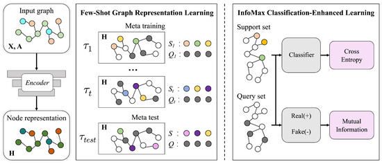 After obtaining the node representations, we could perform classification and evaluate the model based on the misclassification rate. However, when it comes to learning in a few-shot task, the labeled nodes of the support set are limited to a small number, and the unlabeled query set nodes’ number is not fixed. We needed to make the most use of the scanty labels to train a task-specific classifier for unlabeled nodes and also make sure the query set nodes kept a similar feature distribution to the support set nodes. Thus, we propose InfoMax classification-enhanced learning. In a few-shot task, we first train a task-specific classifier with support set nodes and then restrict the query set nodes to have similar feature distribution to the support set nodes with mutual information maximization. By doing so, we enhance the accuracy of the node classification while simultaneously training the network encoder to learn the maximum comparable feature representation for the same class of nodes as before.