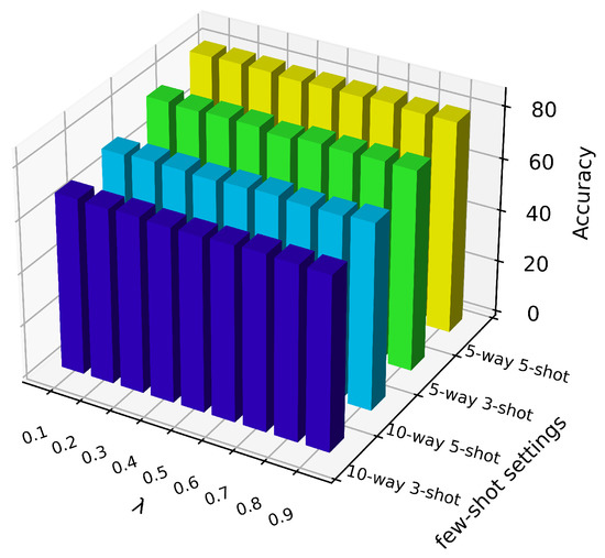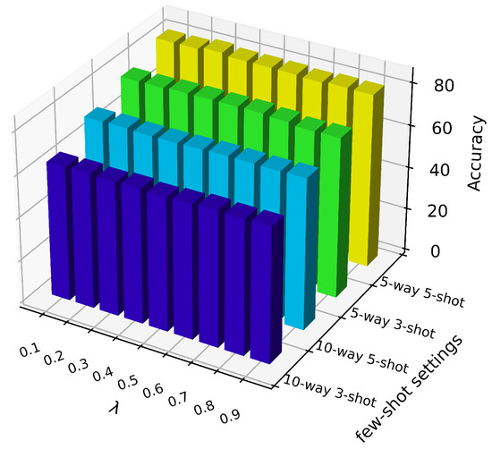 InfoMax classification-enhanced learning has two critical parts: the task-specific classifier trained with the support set nodes and the mutual information constraint trained with the query set nodes. The final objective is obtained from these two parts, and is the balance parameter that controls how important the mutual information constraint loss is in the final objective. In order to determine how selecting impacts the outcome, we performed sensitivity analysis on three different datasets using four distinct sorts of settings, and the accuracy (ACC) results are reported in Figure 2, Figure 3 and Figure 4. From Figure 2 through Figure 4, we were able to conclude that the optimal performance on DBLP was accomplished by setting to 0.3 while using the 5-way 5-shot set-up, while the second-highest accuracy was obtained when on Amazon-Electronics using the same set-up. On the Amazon-Clothing dataset, the accuracy reached its peak when . Under other few-shot settings, the highest accuracies were obtained when , , and . Based on the above observations, we set in the other experiments.