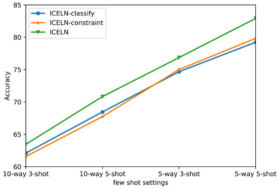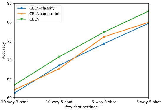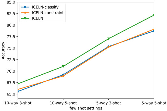 The task-specific classifier and the mutual information constraint in InfoMax classification-enhanced learning jointly promoted the network encoding performance. To validate each component’s effectiveness, we introduced two abbreviated versions of the ICELN for an ablation study: ICELN-classify and ICELN-constraint. ICELN-classify contained the task-specific classifier only, and ICELN-constraint contained the mutual information maximization only. We conducted four kinds of few-shot setting node classification on three relatively larger datasets, and the performances are reported in Figure 5, Figure 6 and Figure 7. As we can see from Figure 5, Figure 6 and Figure 7, the integrated ICELN performed consistently better than the two variant models, which validates the necessity of the task-specific classifier module and the mutual information maximization constraint module in the whole ICELN model. Additionally, we were able to deduce from Figure 5 and Figure 6 that ICELN-classify largely fell behind the full ICELN model, which proves the importance of the mutual information maximization component.
