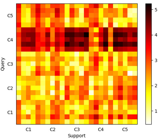 Figure 8 and Figure 9 show the similarity matrices of the raw node feature and the node representation learned by our approach on DBLP with the five-way five-shot task, respectively. The horizontal coordinate is the nodes’ index from the support set in five classes, and the vertical coordinate is the random five query nodes’ index in each query set. Each grid indicates the negative Euclidean distance between two nodes, and the color of the grid demonstrates the divergence between their classes. Figure 8 shows that the nodes were mixed together and had no distinct class patterns. The learned node similarity metric obtained by the ICELN network encoder in Figure 9 demonstrates that the similarities within classes increased while the similarities across classes were decreasing. These two figures display that the ICELN has the capacity to capture class-specific characteristics even when there is only a handful of positive samples in each class.